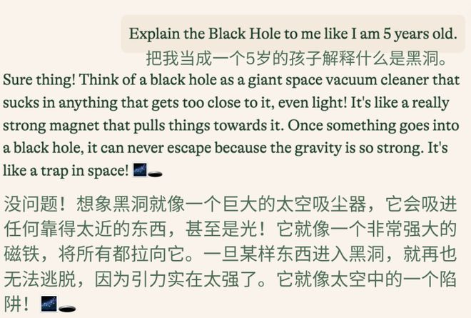 让它向五岁小孩解释高深莫测的宇宙黑洞。深入浅出,比喻贴切,回答得不错。