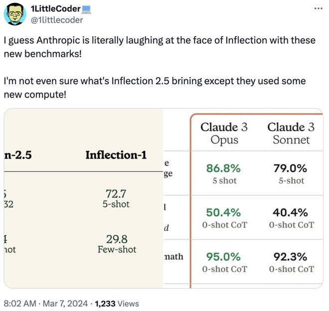说实话,与各路主流LLM 动不动就碾压“业界黄金标准”GPT-4相比,Inflection-2.5的各项数字顶多算不错,实在说不上突出。有网友就搬出刚引发热潮的Claude 3无情打击道:“我猜Anthropic 正在嘲笑 Inflection 新出炉的性能测试结果!除了采用新的计算方法,我看不出Inflection 2.5 到底有什么进步!”