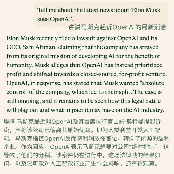 最后测试的是Pi的网络实时搜索能力,看它对近几天发生的Elon Musk起诉OpenAI事件了解多少。Pi阐述了案件核心,也注意到OpenAI最新的回应,本轮表现发挥稳定。
