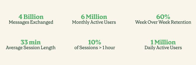 升级后的Pi也在个性化和同理心上做了进一步微调,深受社区欢迎。根据官方数据,目前已经有100万日活跃用户和600万月活跃用户与Pi交换了超过40亿条信息。并且有点牛的是,人们与Pi每天对话的平均持续时间竟达到33分钟之久,十分之一的对话每天持续时长超过1小时。用户粘性上也足以吊打竞争对手,约60%的人在任何一周与Pi交谈后,会在下一周返回。