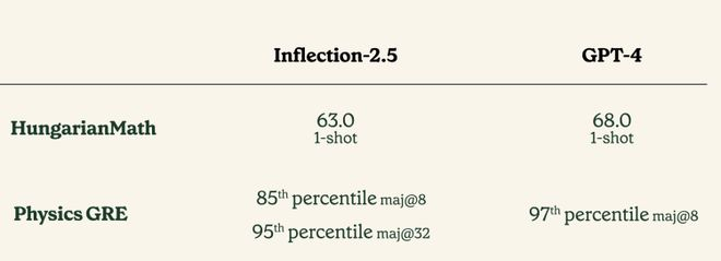 官方测试了升级版对匈牙利数学考试以及物理学研究生入学GRE考试的表现。发现Inflection-2.5在maj@8中能排到人类考生的前15%,在maj@32中几乎可以跻身前5%,接近GPT-4的前3%。