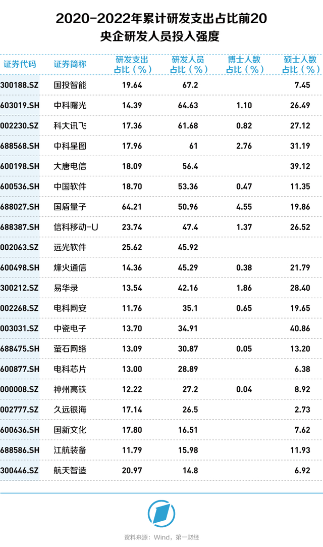 从研发投入力度头部的20家央企情况来看,研发投入与研发人员占比及硕博士员工占比基本匹配。国投智能(300188.SZ)研发人员占比最高,达到67.2%。