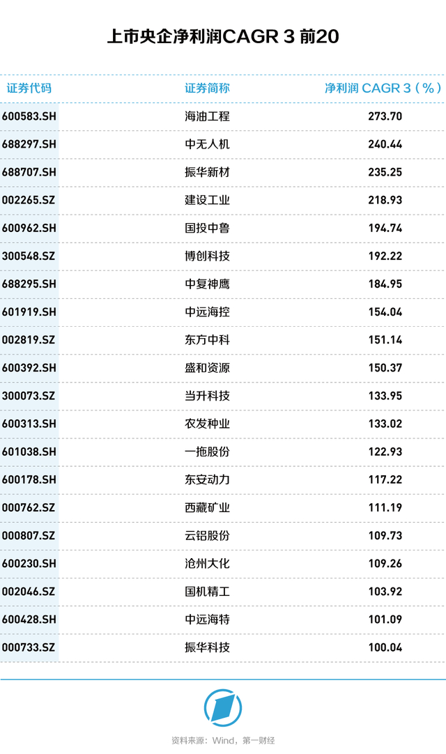 细分来看,近三年营收复合增长率超过50%的有14家,超过100%的有6家,剔除借壳上市、重组等影响因素,深桑达A(000032.SZ)以224%的增速位居首位,其次为天山股份(000877.SZ)、中无人机(688297.SH)增速分别达到139%、 123%。净利润增长方面,中远海控(601919.SH)、东方中科(002819.SZ)和盛和资源(600392.SH)表现较好,近3年复合增长率分别为154%、151%、150%。