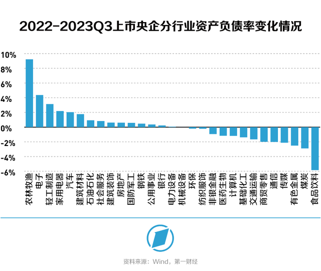 从资产负债率变化来看,相比于2022年,2023年三季度上市央企资产负债率均值实现改善的行业主要有食品饮料、煤炭、有色金属,资产负债率均值分别较2022年下降5.84、2.89、2.51个百分点。尽管农林牧渔、电子及轻工制造等行业的资产负债率仍处于65%的考核目标线之下,但在2023年平均资产负债率却出现了不同程度的提升。