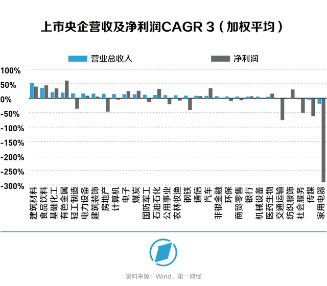 在央企中,也不乏盈利能力下滑的公司。净利润CAGR 3为负的上市央企也有116家,基本达到了四分之一。