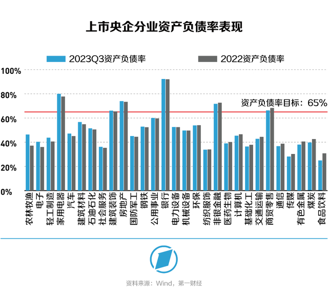 分行业来看,上市央企资产负债率均值排名前五的行业分别为银行、家用电器、房地产、非银金融、商贸零售,均高于65%的国资委考核目标。