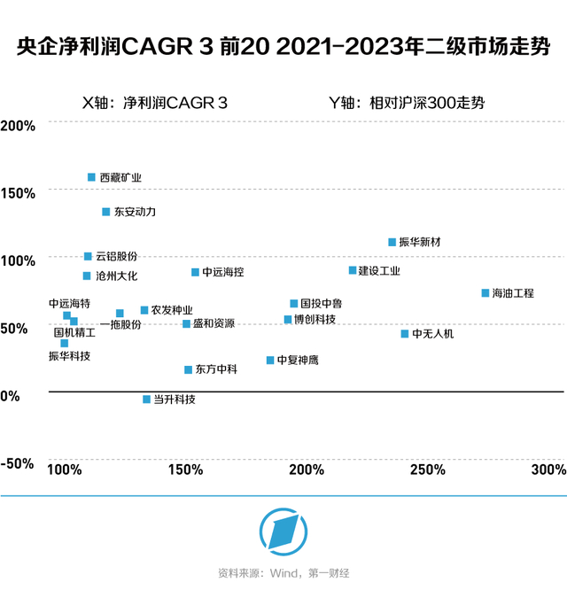 从净利润复合增长排名前20的上市央企来看, 2021-2023年二级市场表现方面,仅2家下跌,仅1家跑输了沪深300,走势最好的西藏矿业(000762.SZ),实现了125%的绝对涨幅,跑赢了沪深300接近160%。