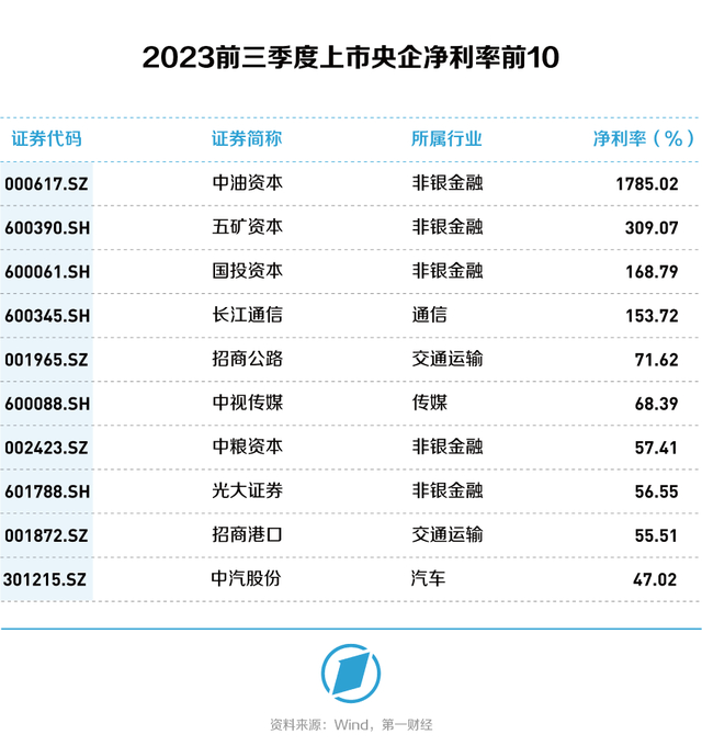 2023年前三季度,上市央企净利率排名居前的公司分布在非银金融、通信、交通运输等行业;净利率排名垫底的公司则分布于房地产、计算机、国防军工等行业。