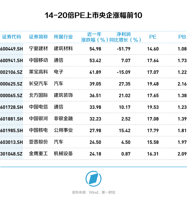 在上市央企中,PE位于14-20倍区间的公司,共有56家。其中公用事业领域的公司最多,共有10家。