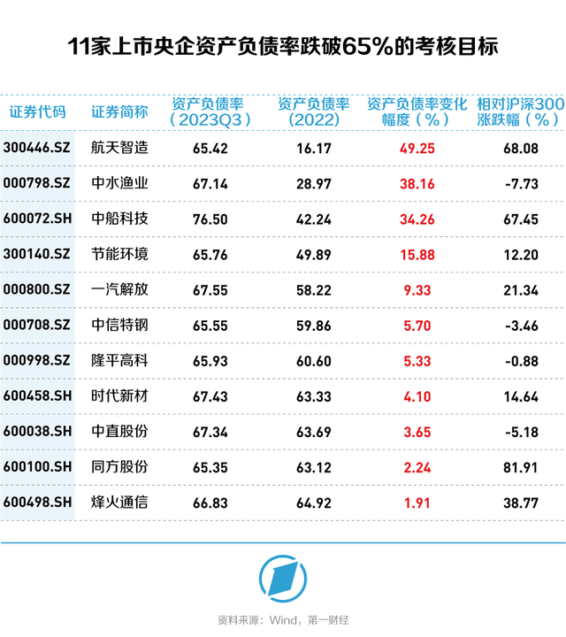 值得注意的是,根据2023年三季报数据,共有225家央企的资产负债情况出现上升。其中,有11家上市央企在2023年资产负债情况跌破了国资委给出的65%的考核“红线”。航天智造(300446.SZ)资产负债率更是大幅抬升了近50个百分点,也使得原本极低的资产负债率飙升至超过65%的考核目标。