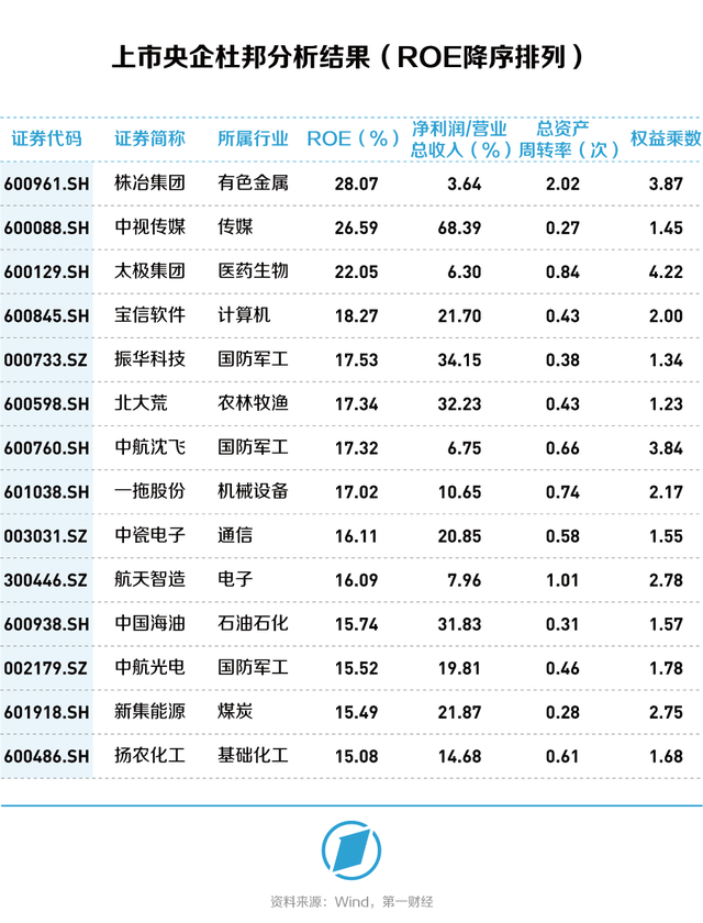 仅凭ROE来分析企业的经营业绩有所片面,在此,我们还使用杜邦分析法,来综合评价上市央企的盈利能力和盈利效率。