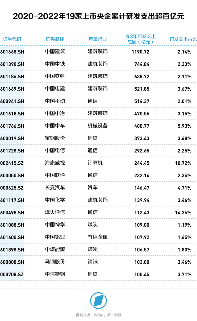 近三年研发支出总额在百亿元以上的共有19家,其中以建筑装饰类央企最多,其次为通信及钢铁行业央企。