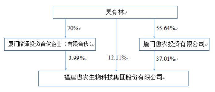 傲农生物实际控制人系吴有林,他通过傲农投资和厦门裕泽投资合伙企业(有限合伙)(现更名为漳州芗城百瑞投资合伙企业(有限合伙),下称百瑞投资)2家公司控制上市公司。