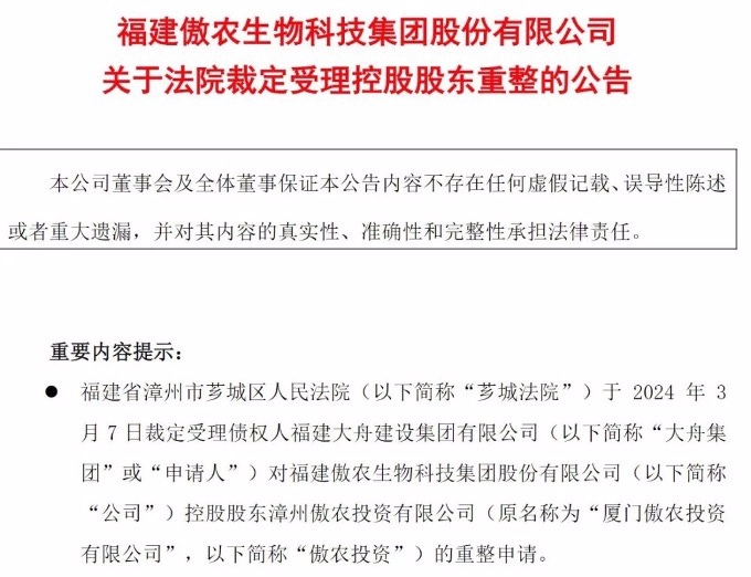据傲农生物公司3月8日公告显示,法院裁定受理公司控股股东重整。据公告,福建省漳州市芗城区人民法院(以下简称“芗城法院”)于3月7日裁定受理债权人福建大舟建设集团有限公司(以下简称“大舟公司”)对傲农生物控股股东漳州傲农投资有限公司(以下简称“傲农投资”)的重整申请。