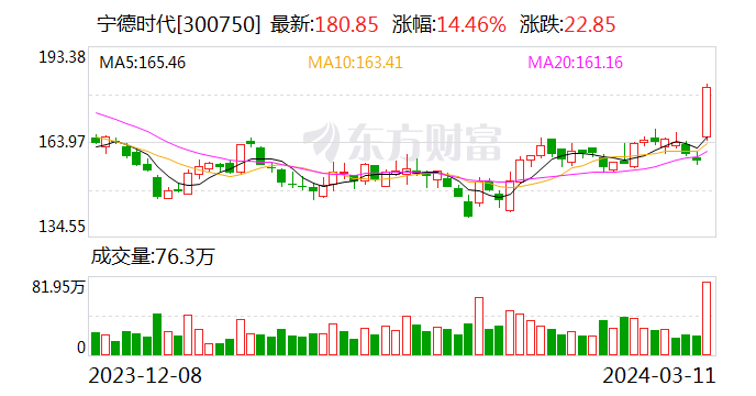 今日(3月11日) 市场全天震荡走高,创业板指领涨,宁德时代涨超14%,两市成交额10059亿,较上个交易日放量1453亿。截至收盘,沪指涨0.74%,深成指涨2.27%,创业板指涨4.6%。