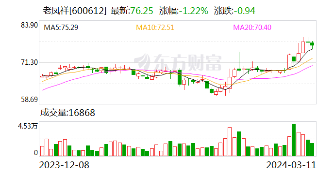无独有偶,3月4日晚间,老凤祥发布业绩快报,称去年营业收入为714.36亿元,同比增长13.37%;归属于上市公司股东的净利润22.14亿元,同比增长30.23%;基本每股收益4.23元。 最新财报显示,报告期内老凤祥黄金珠宝业务收入和利润实现双增长,公司全国范围内新增网点385家,年末总营销网点达到5994家。