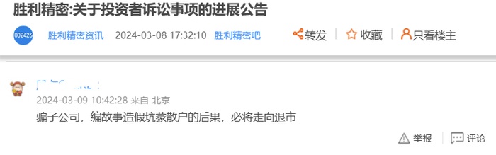 “编故事造假坑蒙散户的后果,必将走向退市。”有投资者在胜利精密的股吧里留下了自己的抱怨。
