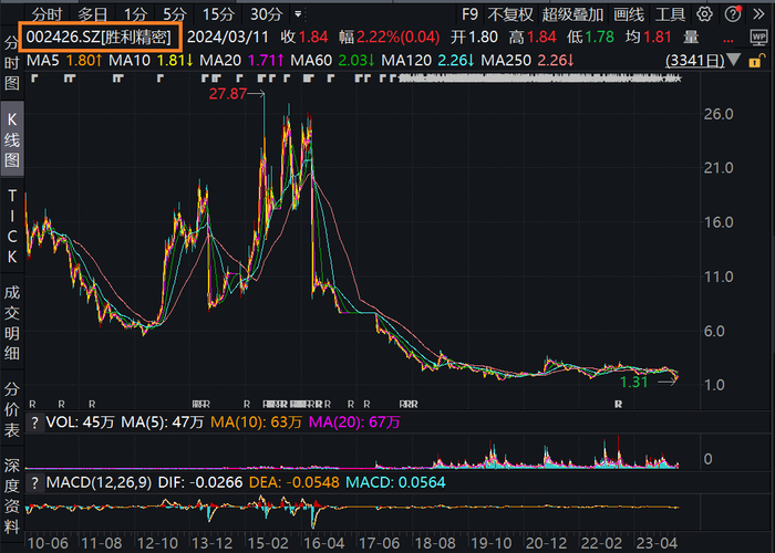 而2024年3月11日收盘,胜利精密的股价仅为1.84元,公司市值约为63亿元,较最高峰蒸发了约200亿市值。