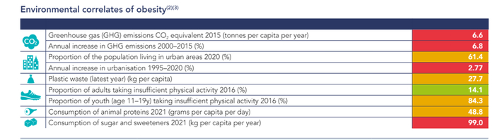 2024年版肥胖地图还讨论了各国肥胖相关的环境因素(表2)。在中国,食品添加糖/甜味剂摄入、城市化、二氧化碳排放量高,都与肥胖显著相关。此外,体力活动不足、塑料废物排放也是造成肥胖的因素之一。