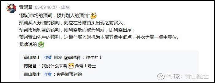 “青陽君”提出,“‘预期市场的预期,预判别人的预判’。预判买入分歧的预判,则应在分歧苗头出现之前买入;预判市场利空的预判,则利空反而成为利好,即利空出尽;预判青山先生的预判,这最佳买入时机为本周五盘中低点,其次为周一集中竞价。”