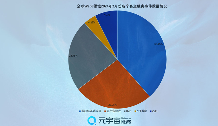 如上图所示,从各细分赛道融资数量来看,区块链基础设施领域有31笔融资,成为2月份融资数量最多的赛道,占整个2月份融资总额的38.75%;其次是元宇宙游戏有21笔,占整个2月份融资数量的26.25%;DeFi领域有19笔,占整个2月份融资数量的23.75%,此外CeFi2月份有6笔,NFT数藏赛道有3笔融资事件。