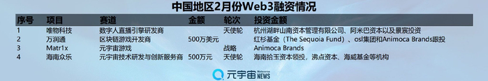 如上图所示中国市场Web3领域2月份有4个项目获得融资。分别为: