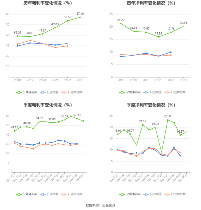 2023年,公司毛利率为57.10%,同比上升3.47个百分点;净利率为20.15%,较上年同期上升2.37个百分点。从单季度指标来看,2023年第四季度公司毛利率为54.80%,同比上升1.09个百分点,环比下降2.53个百分点;净利率为18.07%,较上年同期上升9.21个百分点,较上一季度上升1.50个百分点。