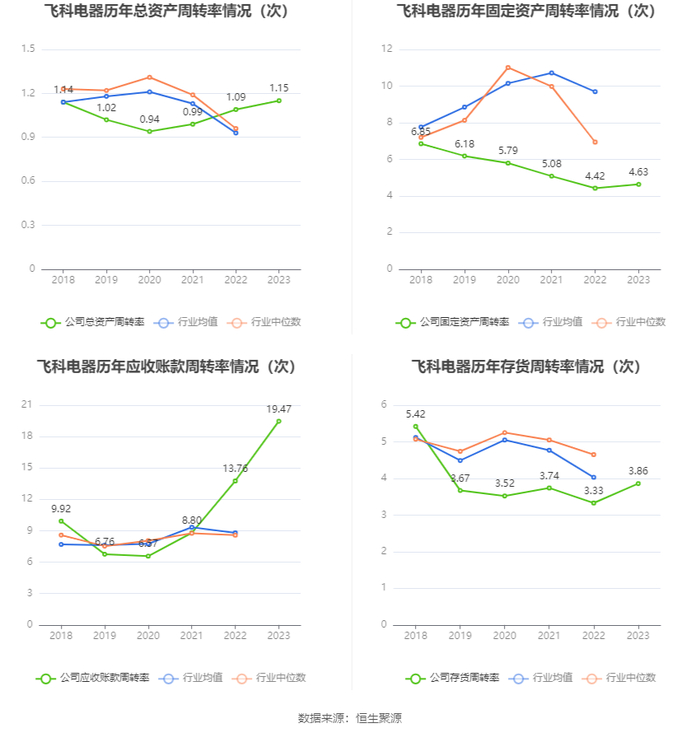 营运能力方面,2023年,公司公司总资产周转率为1.15次,上年同期为1.09次(2022年行业平均值为0.93次,公司位居同行业8/22);固定资产周转率为4.63次,上年同期为4.42次(2022年行业平均值为9.69次,公司位居同行业19/22);公司应收账款周转率、存货周转率分别为19.47次、3.86次。