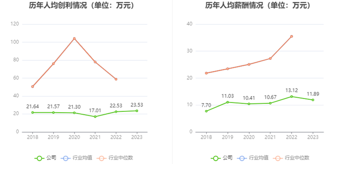 截至2023年末,公司员工总数为4333人,同比增加18.65%,人均创收116.77万元,人均创利23.53万元,人均薪酬11.89万元,较上年同期分别变化-7.84%、4.42%、-9.40%。