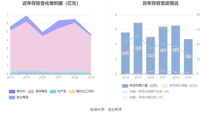 从存货变动来看,截至2023年末,公司存货账面价值为4.73亿元,占净资产的13.22%,较上年末减少1.8亿元。其中,存货跌价准备为441.99万元,计提比例为0.93%。