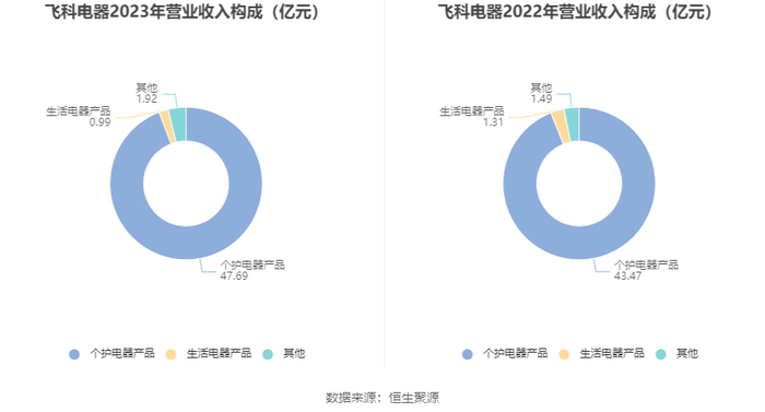 分产品来看,2023年公司主营业务中,个护电器产品收入47.69亿元,同比增长9.70%,占营业收入的94.25%;生活电器产品收入0.99亿元,同比下降24.29%,占营业收入的1.96%。