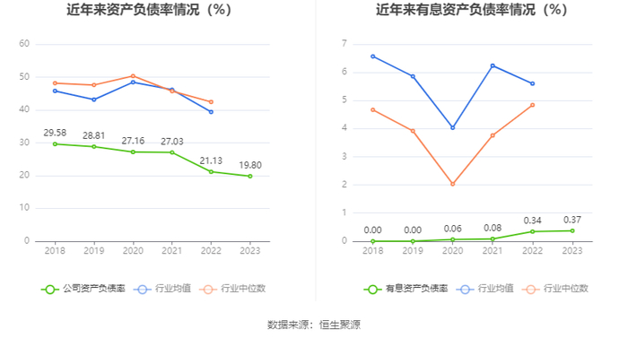 在偿债能力方面,公司2023年年末资产负债率为19.80%,相比上年末下降1.33个百分点;有息资产负债率为0.37%,相比上年末上升0.03个百分点。