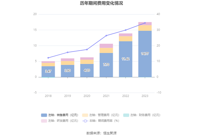 2023年,公司期间费用为17.47亿元,较上年同期增加3.60亿元;期间费用率为34.52%,较上年同期上升4.55个百分点。其中,销售费用同比增长29.28%,管理费用同比增长10.18%,研发费用同比增长11.76%,财务费用由去年同期的-566.95万元变为-667.95万元。