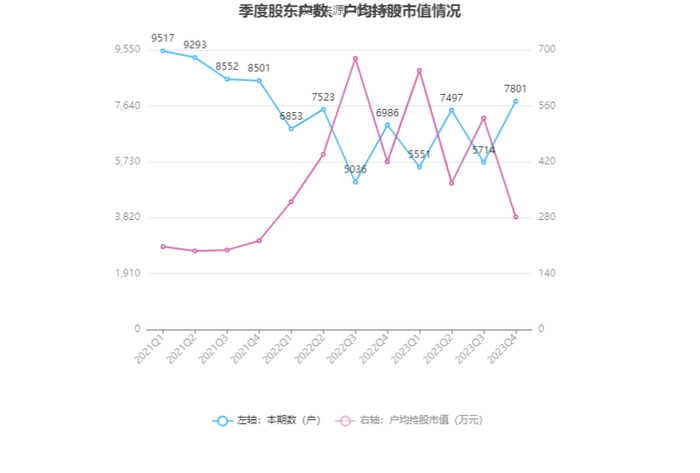 筹码集中度方面,截至2023年年末,公司股东总户数为7801户,较三季度末增长了2087户,增幅36.52%;户均持股市值由三季度末的529.22万元下降至281.99万元,降幅为46.72%。