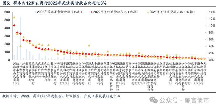 62家农商行中,有12家2022年关注类贷款占比超过3%,绝大多数不到2%(44家)。其中,北京农商行、上海农商行、成都农商行,以及包括无锡银行、杭州联合农商行、常熟银行在内的部分江浙农商行关注类贷款占比较低,均不到1%。37家农商行关注类贷款占比同比下降,河北唐山农商行、武汉农商行、厦门农商行、江门农商行、上虞农商行和苏农银行降幅均在1个百分点以上,改善显著。不过仍有部分农商行关注类贷款占比偏高,且同比恶化,普遍是房地产行业敞口较大的银行,仍需持续关注其信贷资产质量下行压力。