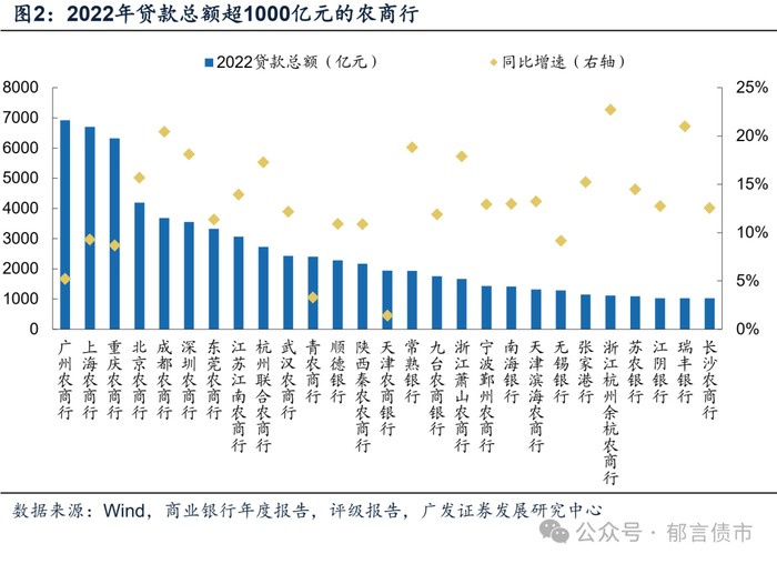 62家农商行中,有27家2022年贷款总额超1000亿元,其中广州农商行、上海农商行和重庆农商行2022年贷款规模排名靠前,均在6000亿元以上,北京农商行、成都农商行、深圳农商行、东莞农商银行和江苏江南农商行在3000亿元以上。2022年样本内农商行贷款规模均同比扩张,其中金华成泰农商行、湖州吴兴农商行和安吉农商行贷款增速在25%以上。