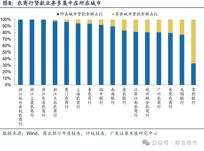 62家农商行中,有26家披露了2022年贷款地区分布情况,这些农商行大多仅在本省内或所在城市开展贷款业务,杭州余杭农商行、上虞农商行、乐清农商行、义乌农商行、厦门农商行、上海农商行、青岛农商行和瑞丰银行,所在城市的贷款余额占比超过90%。一些资产规模较大、风险管控能力较强的农商行有少量的省外业务,如上海农商行、杭州联合农商行等,且多在经济发达区域展业,如上海、江苏、安徽等。
