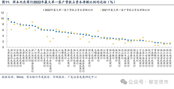 贷款客户集中度方面,主要关注单一客户占比过高对银行贷款质量的潜在影响。样本内的农商行2022年单一客户贷款集中度均在10%的监管指标之内,绝大多数银行客户集中度指标保持在合理水平,不过样本银行平均数来看,最大单一客户贷款占资本净额比例从4.06%上升至4.46%。