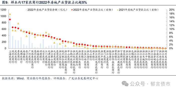 具体来看,2022年,样本内农商行房地产贷款占比分布于0%-14.98%之间,其中17家房地产贷款占比超5%,37家占比同比上升。房地产占比较高的农商行,普遍位于经济实力比较强的城市,区域内房地产业较为发达,如SH农商银行、SZ农商行、WH农商行和QD农商行2022年房地产贷款占比最高,均超过10%;CD农商行、NH银行和CS农商行在8%-10%之间。房地产贷款占比超5%的农商行,绝大多数在压降房地产贷款占比,以控制房地产行业下行冲击下的信贷风险。而多数本身房地产贷款规模较小的农商行则在进一步扩大房地产行业敞口,整体有超六成农商行2022年房地产贷款占比上升。