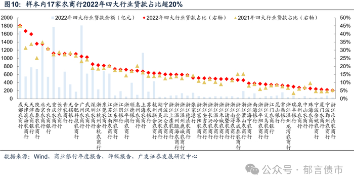 对公贷款行业分布方面,样本内农商行2022年房地产和城投相关行业贷款多数同比提升。2022年,样本内农商行房地产贷款占比为5.62%,同比下降0.12个百分点,主要是部分房地产贷款占比偏高的农商行积极压降房地产敞口,但样本内仍有超六成的农商行房地产业贷款占比同比增加。与此同时,样本内大部分农商行加大对城投相关行业的支持力度,四大行业贷款占比21.80%,同比提升1.2个百分点。