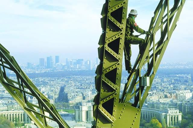高大的埃菲尔铁塔从不给人“笨重”的感觉,这要归功于古斯塔夫·埃菲尔的轻盈设计,以及随时代变化的外观颜色,这些让她拥有更持久的美感和生命力。按照埃菲尔当年的建议,铁塔需要每7年重新油漆一次——这不只是为了让她看上去更加靓丽,更是对金属构件的一种防腐保护。迄今为止,埃菲尔铁塔已经历20次油漆,最新的一次从2019年开始,这就是为什么这两年来到巴黎,慕名参观铁塔、在战神广场拍照的游客,会发现铁塔周围一直搭建有脚手架和保护网,埃菲尔铁塔花园也对公众时不时关闭。法国人的施工效率本就不高,况且给铁塔刷漆是个专业、细致的活儿。