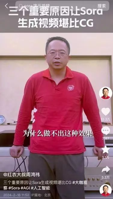 当AI新词汇不断冲击着大众的认知,人工智能成为了潮水中的巨兽,它势不可挡,又难以捉摸,带给教育、产业、投资种种焦虑。360集团创始人周鸿祎用他”红衣大叔“的IP,在抖音通过短视频解读、开设人工智能免费公开课直播的形式,向大众科普人工智能,结合他的专业领域提供真实、有用的知识,也减轻当下大众对人工智能这个概念的焦虑。