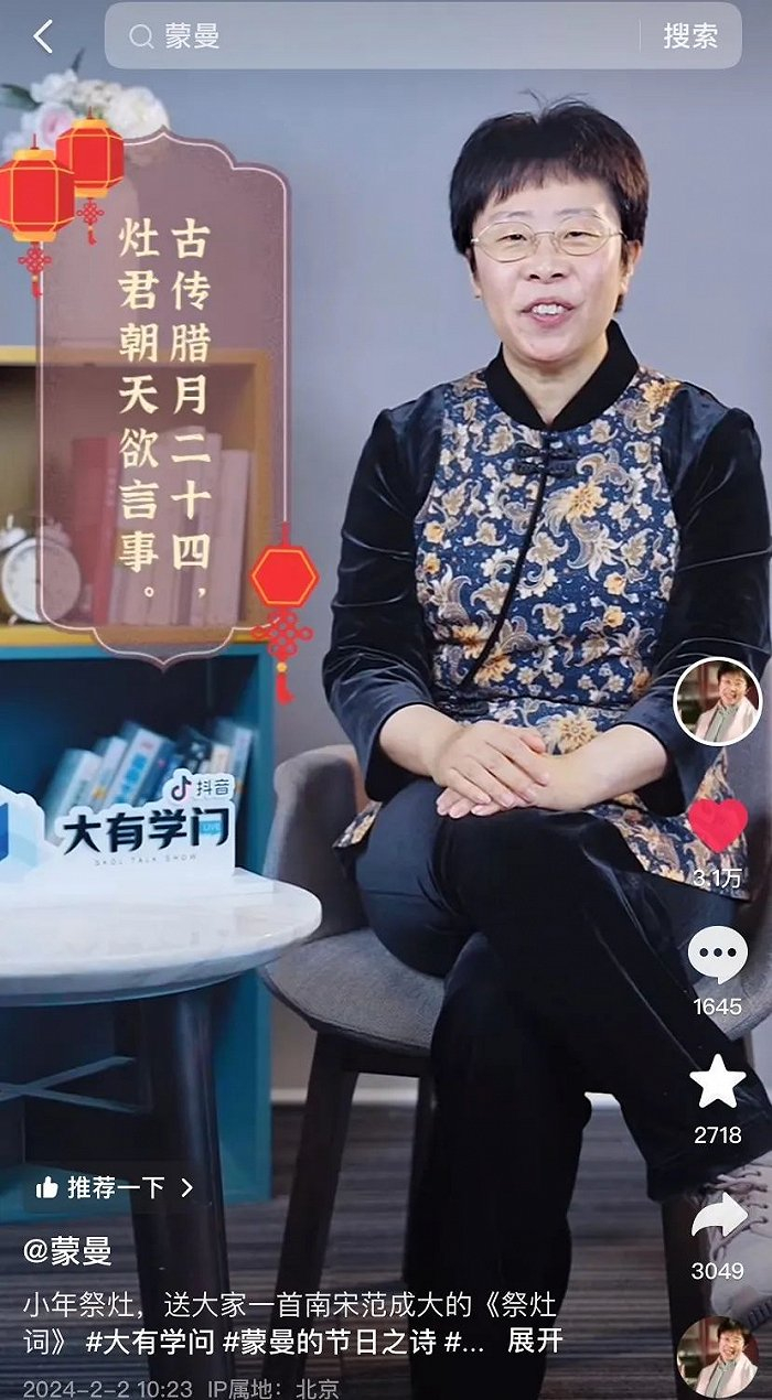 小年夜当天,历史文化学者蒙曼以一首南宋范成大的《祭灶词》引申出小年夜的祭灶习俗,并解释南北方小年夜的差异。除夕夜时,蒙曼又以陆游的一首《除夜》,介绍了各地守岁的风俗习惯,增添了浓浓的节日氛围感。