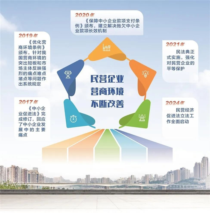 例如,2019年国务院颁布《优化营商环境条例》,针对我国营商环境的突出短板和市场主体反映强烈的痛点难点堵点等问题作出系统规定;2020年国务院发布《保障中小企业款项支付条例》,建立解决拖欠中小企业款项长效机制;2021年民法典正式实施,强化了对民营企业的平等保护。