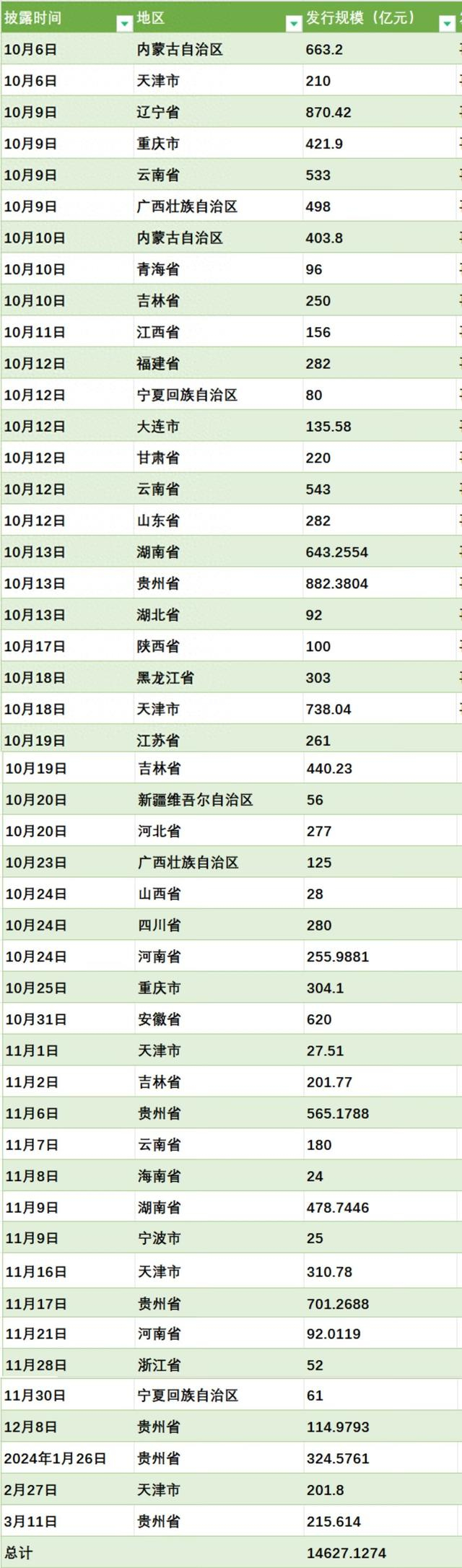 3月11日,贵州省在中国债券信息网披露的文件显示,其拟于3月18日发行特殊再融资债券215.614亿元。这是贵州自2023年10月以来第6次披露拟发行特殊再融资债券,已发行及拟发行规模合计2803.9974亿元。截至目前,全国披露的特殊再融资债券总额已达14627.1274亿元。