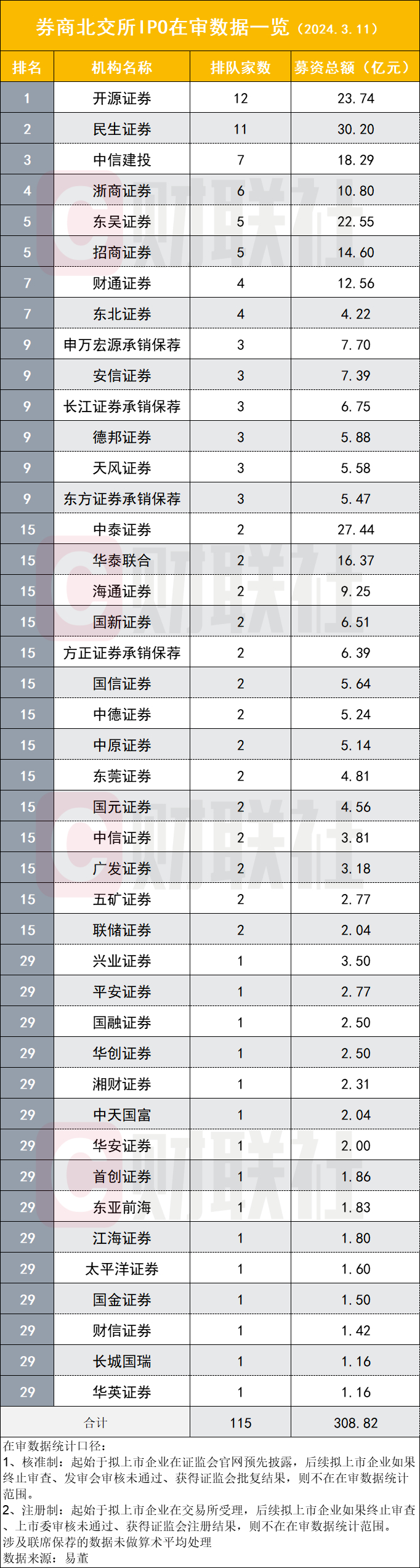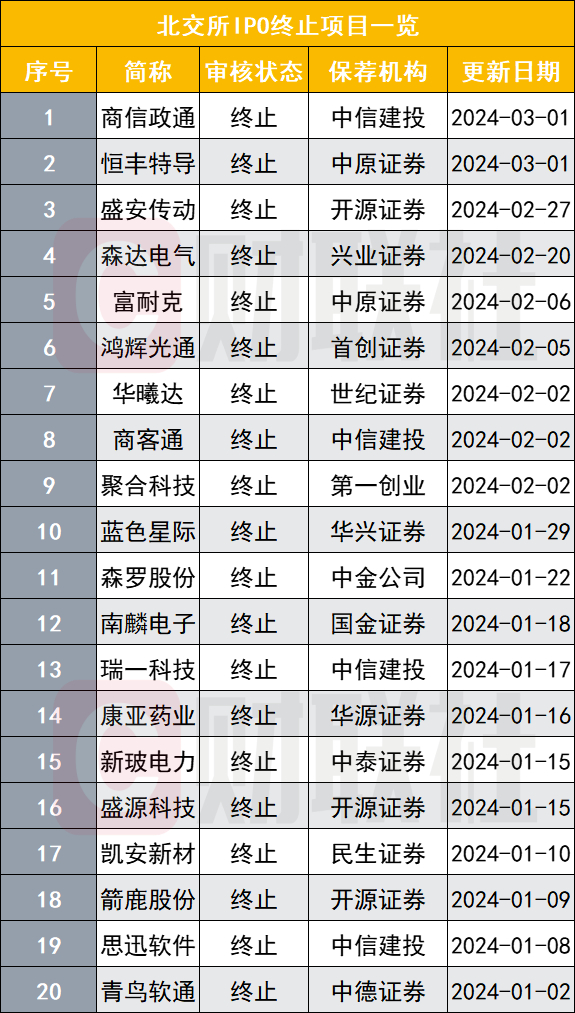 综合多维度数据来看,截至3月11日,今年以来,北交所仅6家上市,融资额同比下降30.74%;20家IPO终止,其中19家因撤回材料,终止项目较多的三家券商分别是中信建投(4家)、开源证券(3家)、中原证券(2家);在审IPO数量高达115家,同比增64.29%;今年前两个月,已有12家企业在沪深交易所碰壁后转向北交所。
