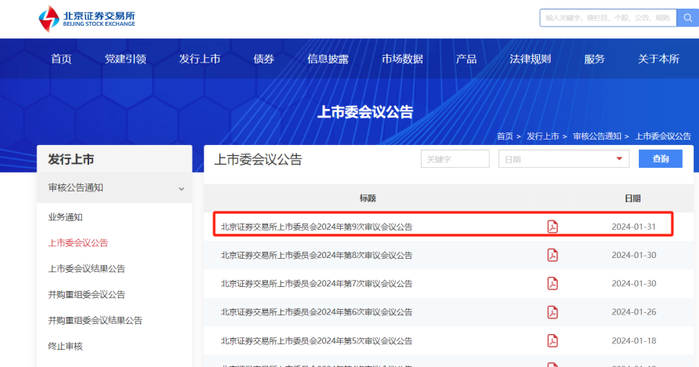 目前,北交所上市委会议公告仍停留在一个月前,即“2024-01-31”,上市委会议结果公告停留在“2024-02-06”。