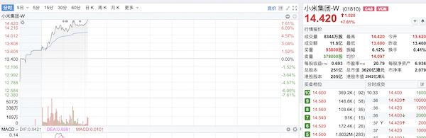 受此消息影响,3月12日开盘,小米集团港股短线拉升,截至10点30分许,股价报14.42港元,涨超7%,市值拉升超256亿港元。