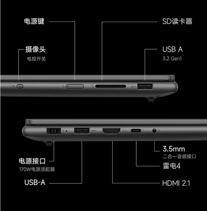 两款新机都将提供 2 Type-A+Type-C+HDMI + 全尺寸读卡器以及 3.5mm 耳机孔等接口,其中 Pro 14s 多一个 Type-C 口,而 Pro16s 因为采用了更加顶级的配置所以采用了方形的电源接口。