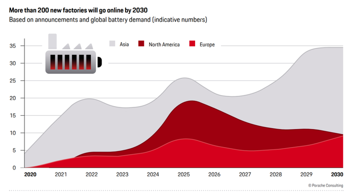 不久前,在欧洲工业界极具影响力的保时捷管理咨询公司与德国机械设备制造业联合会(VDMA)共同发布了一份报告《电池制造2030:极速协作》,其中将锂电与半导体行业相对比,指出2030年锂电市场规模有望达到5500亿欧元规模,预计仅用十年时间就能赶上半导体市场1980-2020年的发展成就。而为满足这样的惊人市场增长,到2030年锂离子电池电芯、模组制造装备的累积投资也将达到约3000亿欧元之巨,而根据该报告梳理,目前全球范围内锂电大规模制造设施“主要配备来自亚洲的生产技术,中国装备制造商目前正在制定全方位服务提供商的国际标准,这些工厂中只有8%的高科技设备来自欧洲”。